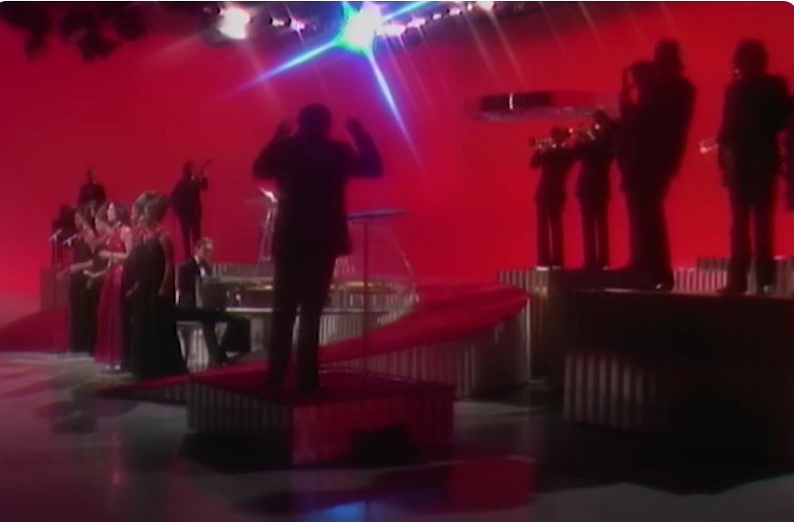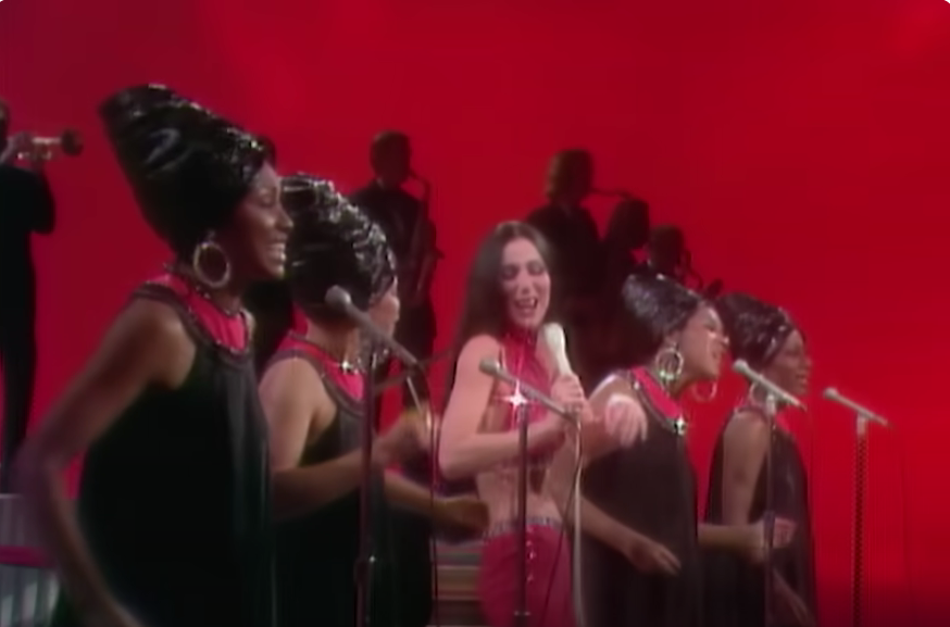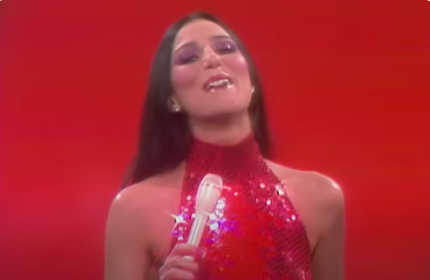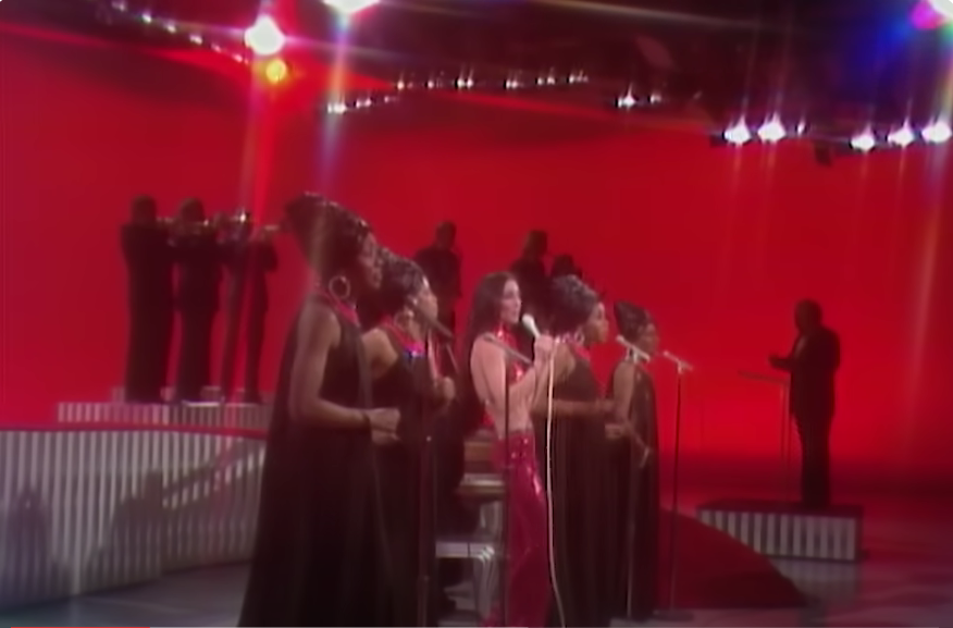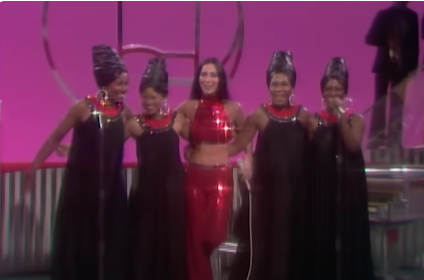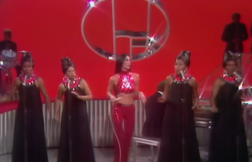 Cher wears a sparkly tank top and matching pants. Her backup singers stand in a line with her. Cher tries to get gritty in the middle but it mostly just sounds manic, just like when she tried to sing “Listen to the Music” with Sonny. Not a number she pulls off. The backup singers do some interesting things however. They do a group hug at the end.