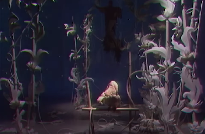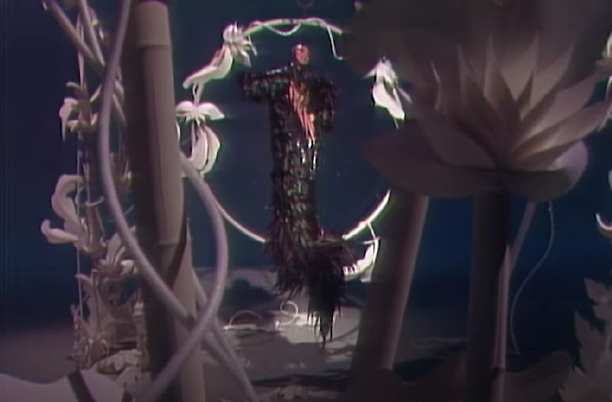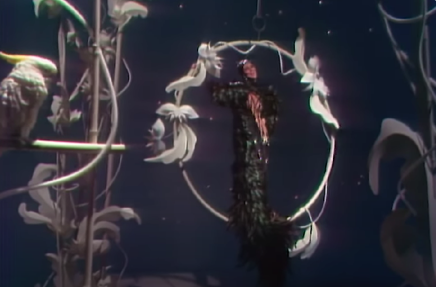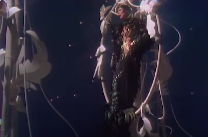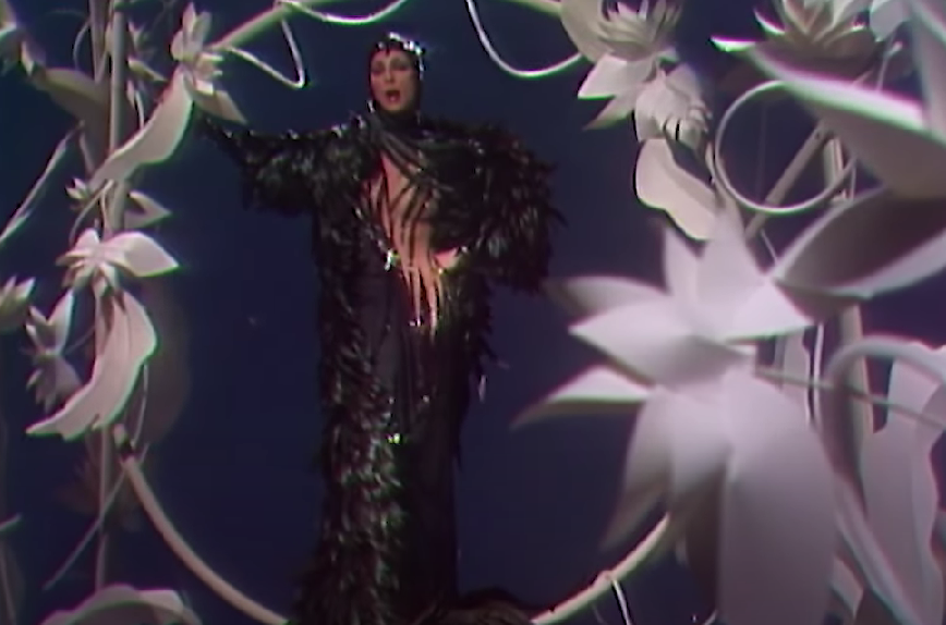 This is a lovely set, built to house an actual parrot and Cher dressed like a blackbird and perched like a bird on a swinging perch. White paper leaves everywhere. The set gets three stars. The dress is a nude dress with black strips and a matching hat of black feathers, with a big swoop coming down over her neck. She wears a feathered coat and appears to be perched herself on a bird ring.