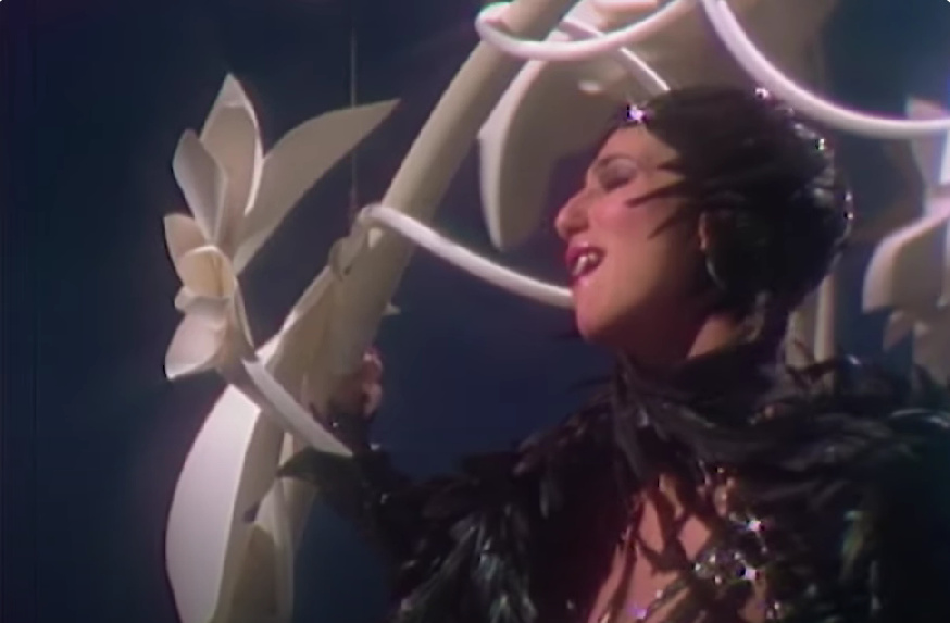 Cher looks like a white triangle under a huge white feather hat and boa. She throws it off to reveal a white dress with a white feather trim at the bottom. The stage curtain this week looks like a negligee. This is early jiggle TV. When Cher sings “rock it to ya” she almost seems to be rolling her eyes. This is a good opening song, delicately slow at first and then the uptempo isn’t too forced.