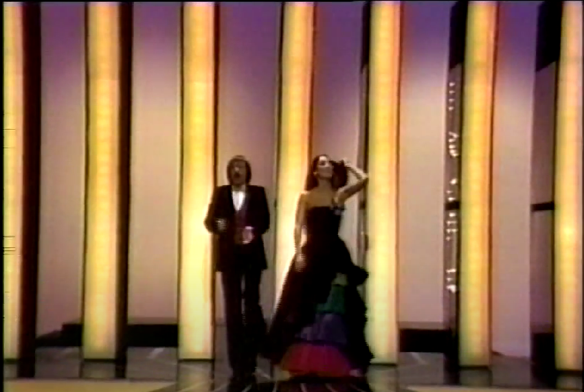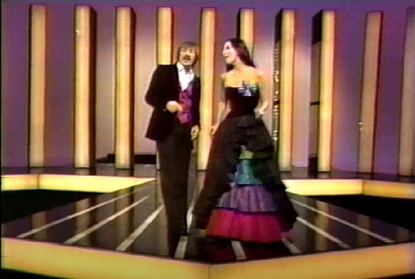 Cher wears a black crumb-catcher (as James calls it) with a very colorful, shiny, hooped underskirt. Her hair is very thick. Sonny wears a suit with a white shirt and matching purple vest. We actually catch Cher looking lovingly at Sonny when she sings, “Do you remember the day when you first came my way.” They look like they’re having fun. I loved this song as a kid.
